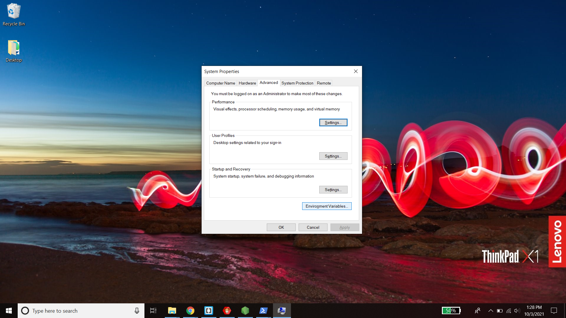 - In the window that opens, select the "advanced" tab and click the "Environment Variables" button at the bottom right