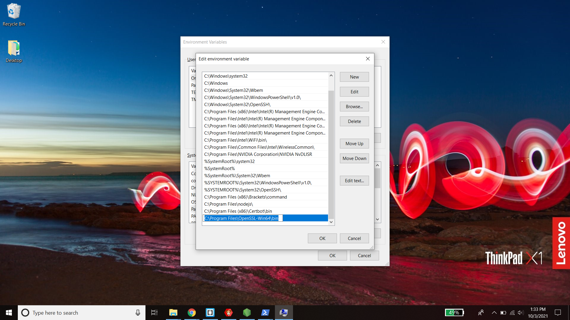 - Click "New" at the top right and and paste the location to the "bin" folder where you installed openssl. For me, the default location was "C:\Program Files\OpenSSL-Win64\bin"